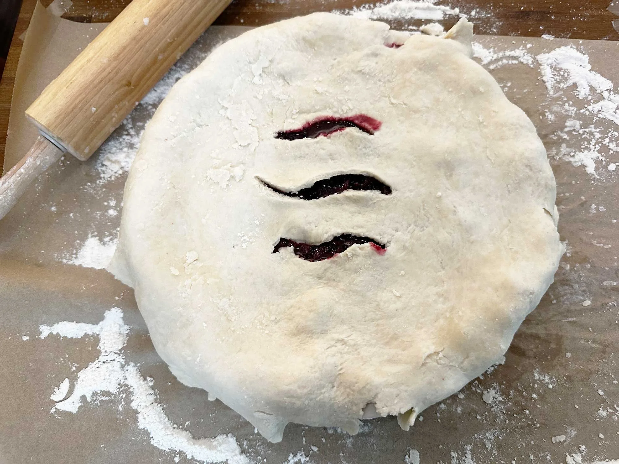 10. After the top dough layer has been rolled out, cut a simple design in the middle. This will allow the air to escape from the apple mixture as it bakes.