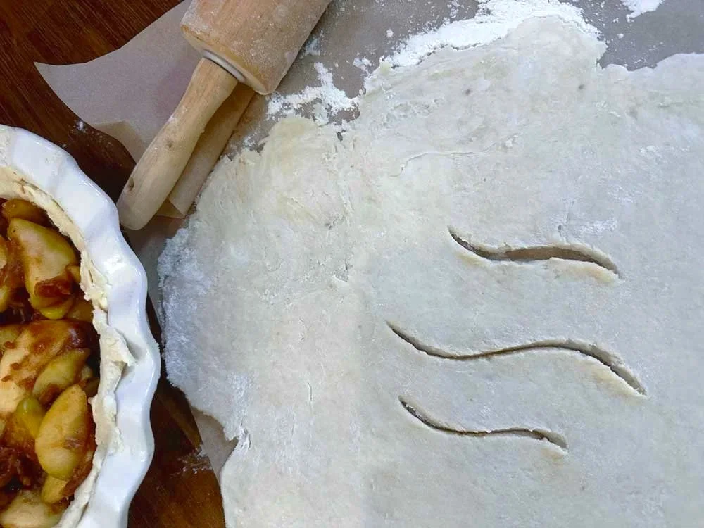 10. After the top dough layer has been rolled out, cut a simple design in the middle. This will allow the air to escape from the apple mixture as it bakes.